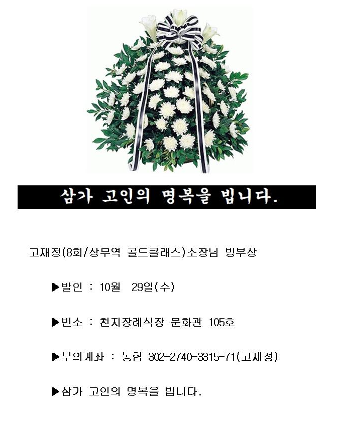 부고 | 고재정(8회/상무역 골드클래스)소장님 빙부상 페이지 정보 작성자 관리자 작성일25-10-27 13:10 조회92회 댓글3건 관련링크 이전글 다음글 목록 본문 . 댓글목록 서금석님의 댓글 서금석 작성일 25-10-27 14:35 삼가 고인이 명복을 빕니다. 삼가 고인이 명복을 빕니다. 여재학님의 댓글 여재학 작성일 25-10-27 20:26 삼가 고인이 명복을 빕니다. 삼가 고인이 명복을 빕니다. 최희규님의 댓글 최희규 작성일 25-10-29 10:54 삼가고인의명복을빕니다 삼가고인의명복을빕니다