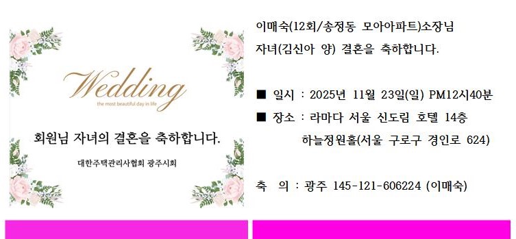 결혼 | 이매숙(123회/송정동 모아)소장님 자녀결혼 페이지 정보 작성자 관리자 작성일25-11-03 10:23 조회25회 댓글1건 관련링크 이전글 다음글 목록 본문 . 댓글목록 서금석님의 댓글 서금석 작성일 25-11-03 13:23 이매숙 소장님, 따님의 결혼을 하늘만큼 축하드립니다. 이매숙 소장님, 따님의 결혼을 하늘만큼 축하드립니다.