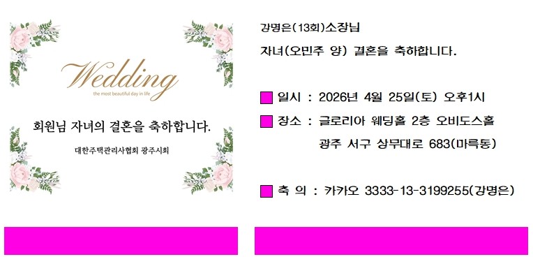 결혼 | 강명은(13회)소장님 자녀결혼 페이지 정보 작성자 관리자 작성일26-04-13 15:21 조회110회 댓글3건 관련링크 다음글 목록 본문 . 댓글목록 차상국님의 댓글 차상국 작성일 26-04-15 23:50 자녀의 결혼을 축하드립니다. 자녀의 결혼을 축하드립니다. 안동완님의 댓글 안동완 작성일 26-04-16 09:12 자녀 결혼을 축하합니다. 자녀 결혼을 축하합니다. 윤하정님의 댓글 윤하정 작성일 26-04-16 09:26 자녀 결혼을 진심으로 축하드려요~ 자녀 결혼을 진심으로 축하드려요~