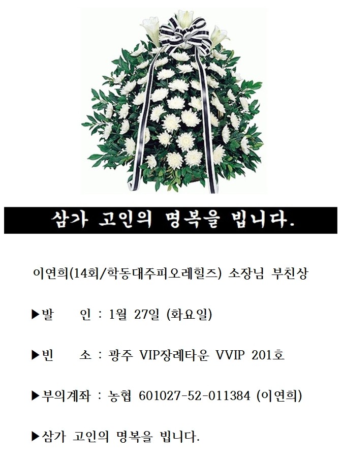 부고 | 이연희(14회/학동대주피오레힐즈)소장님 부친상 페이지 정보 작성자 관리자 작성일26-01-26 09:32 조회42회 댓글1건 관련링크 이전글 다음글 목록 본문 . 댓글목록 안동완님의 댓글 안동완 작성일 26-01-26 19:43 삼가 고인의 명복을 빕니다. 삼가 고인의 명복을 빕니다.