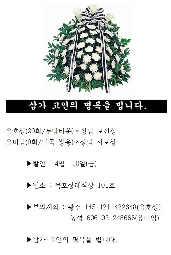 부고 | 유호성(20회/두암타운)소장님 모친상 / 유미임(9회/일곡쌍용)소장님 시모상