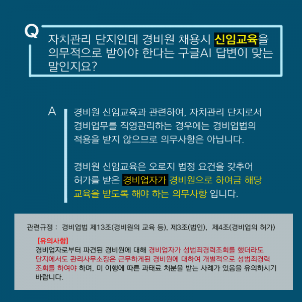 자치관리 단지인데 경비원에 대한 신임교육이 의무인지? [질의] 자치관리단지입니다. 경비를 직접 채용하여 직영관리하고 있는데 경비원 신규채용시 경비원에 대한