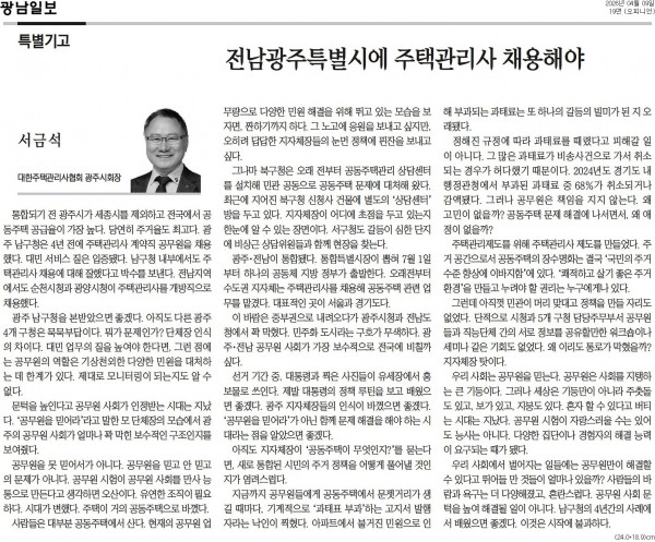 [기고]공동주택 부서에 전남광주특별시 주택관리사 채용해야 페이지 정보 작성자 관리자 쪽지보내기 메일보내기 자기소개 아이디로 검색 전체게시물 쪽지보내기 메일보내기 자기소개 아이디로 검색 전체게시물 작성일26-04-09 15:28 조회6회 댓글0건 관련링크 목록 본문 [특별기고]공동주택 부서에 전남광주특별시 주택관리사 채용해야 [기사원문] http://www.gwangnam.co.kr/article.php?aid=1775640194534653129 댓글목록 등록된 댓글이 없습니다.