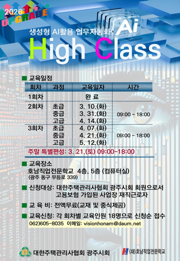 생성형 AI활용, 업무자동화 2026년 업그레이드 과정 [붙임] 협약서와 교육참가신청서를 작성하시어 visionhonam@daum.net으로 보내주시기 바랍니다. 자세한 문의는 전화 062)605-8035로 해주시기 바랍니다.