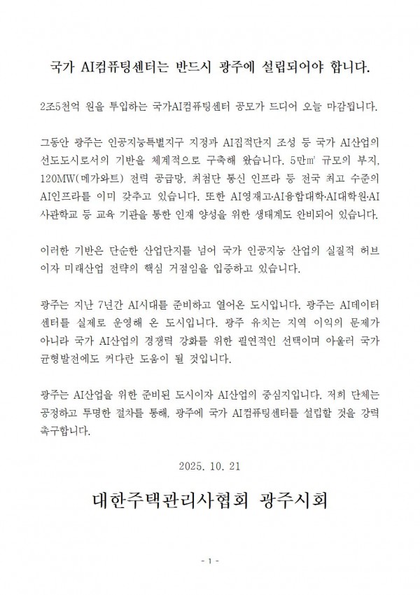 국가 AI컴퓨팅센터는 반드시 광주에 설립되어야 합니다. 페이지 정보 작성자 관리자 쪽지보내기 메일보내기 자기소개 아이디로 검색 전체게시물 쪽지보내기 메일보내기 자기소개 아이디로 검색 전체게시물 작성일25-10-21 18:16 조회43회 댓글0건 첨부파일 대한주택관리사협회 광주시회.hwp (77.0K) 1회 다운로드 DATE : 2025-10-21 18:16:16 관련링크 목록 본문 댓글목록 등록된 댓글이 없습니다.
