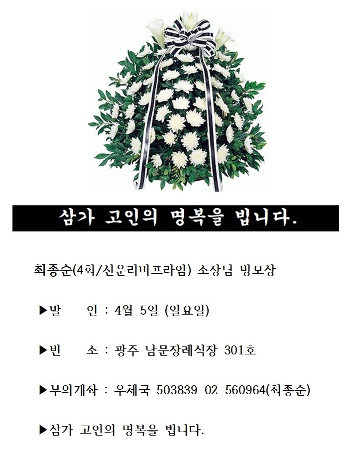 부고 | 최종순(4회/선운리버프라임)소장님 빙모상 페이지 정보 작성자 관리자 작성일26-04-03 14:51 조회16회 댓글2건 관련링크 다음글 목록 본문 . 댓글목록 여재학님의 댓글 여재학 작성일 26-04-03 16:51 삼가 고인의 명복을 빕니다. 삼가 고인의 명복을 빕니다. 안동완님의 댓글 안동완 작성일 26-04-03 16:56 삼가 고인의 명복을 빕니다. 삼가 고인의 명복을 빕니다.