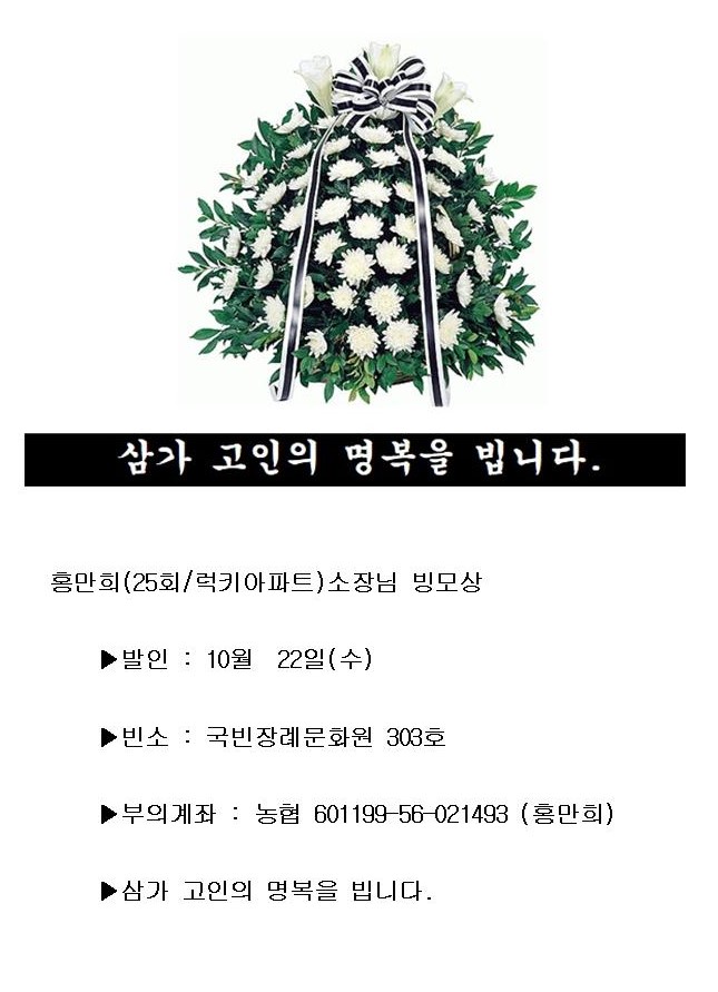 부고 | 홍만희(25회/럭키아파트)소장님 빙모상 페이지 정보 작성자 관리자 작성일25-10-20 16:55 조회49회 댓글2건 관련링크 이전글 다음글 목록 본문 . 댓글목록 여재학님의 댓글 여재학 작성일 25-10-21 09:02 삼가 고인의 명복을 빕니다. 삼가 고인의 명복을 빕니다. 서금석님의 댓글 서금석 작성일 25-10-22 09:09 삼가 고인의 명복을 빕니다. 삼가 고인의 명복을 빕니다.