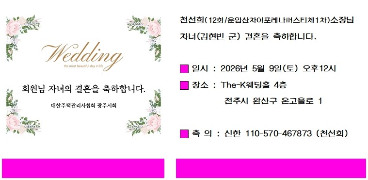 결혼 | 천선희(12회/운암자이포레나퍼스티체1단지)소장님 자녀결혼 페이지 정보 작성자 관리자 작성일26-04-09 14:40 조회13회 댓글0건 관련링크 다음글 목록 본문 . 댓글목록 등록된 댓글이 없습니다.