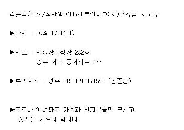 부고 | 김준남(11회/첨단AM-CITY센트럴파크2차)소장님 시모상 페이지 정보 작성자 관리자 작성일21-10-15 12:55 조회5,432회 댓글1건 관련링크 이전글 다음글 목록 본문 . 댓글목록 서금석님의 댓글 서금석 작성일 21-10-16 22:20 삼가 고인의 명복을 빕니다. 삼가 고인의 명복을 빕니다.