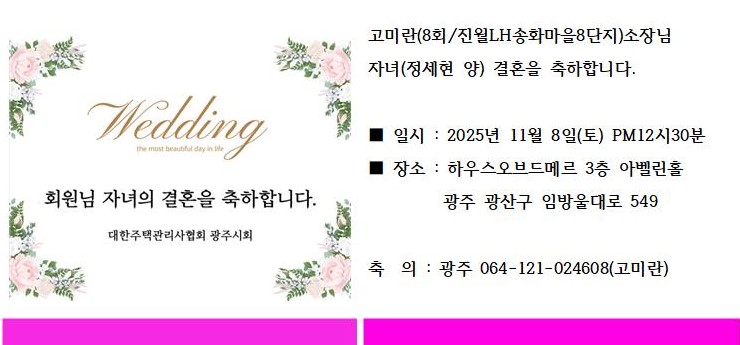 결혼 | 고미란(8회/진월LH송화마을8단지)소장님 자녀결혼 페이지 정보 작성자 관리자 작성일25-10-30 14:24 조회111회 댓글2건 관련링크 이전글 다음글 목록 본문 . 댓글목록 여재학님의 댓글 여재학 작성일 25-10-31 10:12 자녀분의 결혼을 진심으로 축하드립니다. 자녀분의 결혼을 진심으로 축하드립니다. 서금석님의 댓글 서금석 작성일 25-11-03 13:23 고미란 소장님, 따님의 결혼을 하늘만큼 축하드립니다. 고미란 소장님, 따님의 결혼을 하늘만큼 축하드립니다.