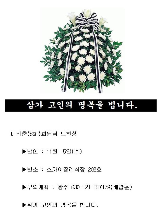 부고 | 배갑춘(8회)회원님 모친상 페이지 정보 작성자 관리자 작성일25-11-03 13:21 조회92회 댓글2건 관련링크 다음글 목록 본문 . 댓글목록 서금석님의 댓글 서금석 작성일 25-11-03 13:21 삼가 고인의 명복을 빕니다. 삼가 고인의 명복을 빕니다. 고재순님의 댓글 고재순 작성일 25-11-04 17:15 삼가 고인의 명복을 빕니다 삼가 고인의 명복을 빕니다