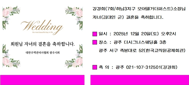 최정애님의 댓글 최정애 작성일 25-12-17 12:29 소장님. 초겨울..좋은날.. 자제(아들) 결혼 축하드립니다.. 소장님. 초겨울..좋은날.. 자제(아들) 결혼 축하드립니다..