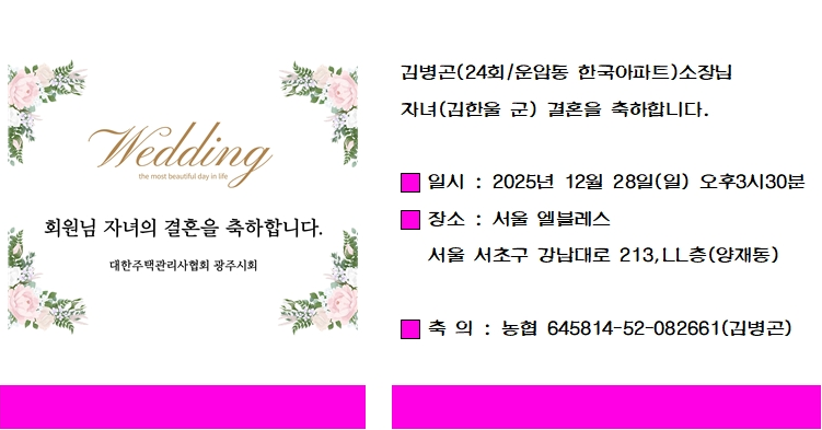 결혼 | 김병곤(24회/운암동 한국아파트)소장님 자녀결혼 페이지 정보 작성자 관리자 작성일25-12-22 09:24 조회55회 댓글2건 관련링크 다음글 목록 본문 . 댓글목록 여재학님의 댓글 여재학 작성일 25-12-22 13:19 자녀분의 결혼을 축하드립니다. 자녀분의 결혼을 축하드립니다. 서금석님의 댓글 서금석 작성일 25-12-22 15:21 김병곤 소장님, 아드님의 결혼을 하늘만큼 축하드립니다. 김병곤 소장님, 아드님의 결혼을 하늘만큼 축하드립니다.