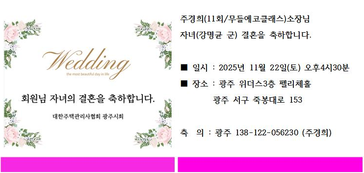 결혼 | 주경희(11회/무들에코클래스)소장님 자녀결혼 페이지 정보 작성자 관리자 작성일25-11-17 08:51 조회273회 댓글2건 관련링크 이전글 다음글 검색 목록 본문 . 댓글목록 여재학님의 댓글 여재학 작성일 25-11-17 12:46 자녀분의 결혼을 축하드립니다. 자녀분의 결혼을 축하드립니다. 서금석님의 댓글 서금석 작성일 25-11-26 05:48 주경희 소장님, 아드님의 결혼을 하늘만큼 축하드립니다. 주경희 소장님, 아드님의 결혼을 하늘만큼 축하드립니다.