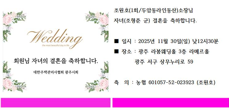 결혼 | 조원호(1회/두암동라인동산)소장님 자녀결혼 페이지 정보 작성자 관리자 작성일25-11-20 18:29 조회210회 댓글2건 관련링크 이전글 다음글 검색 목록 본문 . 댓글목록 여재학님의 댓글 여재학 작성일 25-11-25 16:55 자녀분의 결혼을 축하드립니다. 자녀분의 결혼을 축하드립니다. 서금석님의 댓글 서금석 작성일 25-11-26 05:47 조원호 소장님, 아드님의 결혼을 하늘만큼 축하드립니다. 조원호 소장님, 아드님의 결혼을 하늘만큼 축하드립니다.