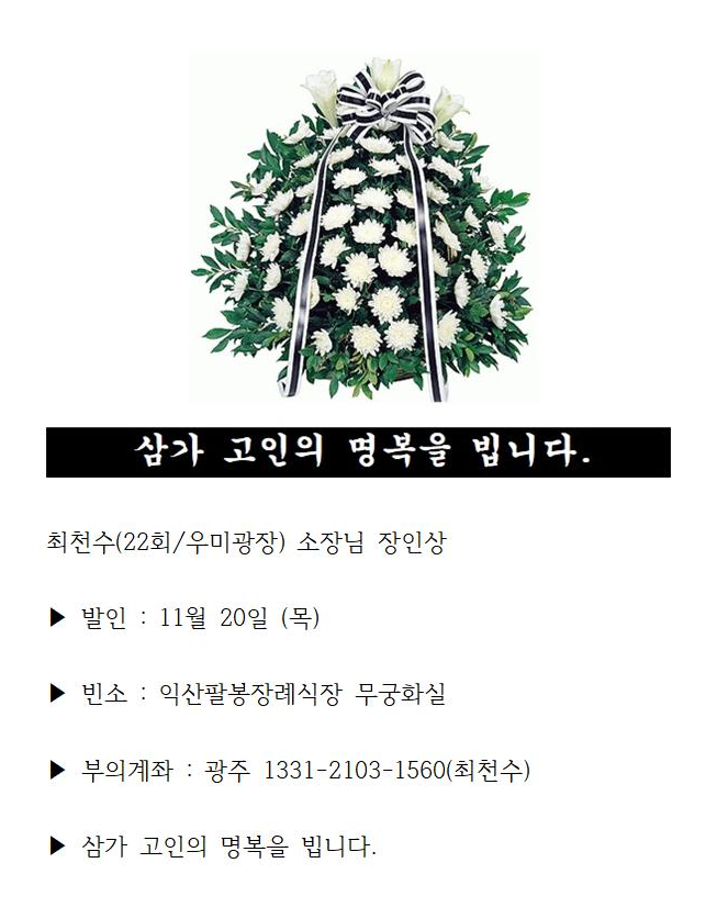 부고 | 최천수(22회/우미광장)소장님 장인상 페이지 정보 작성자 관리자 작성일25-11-18 21:36 조회213회 댓글2건 관련링크 이전글 다음글 목록 본문 . 댓글목록 여재학님의 댓글 여재학 작성일 25-11-19 08:52 삼가 고인의 명복을 빕니다. 삼가 고인의 명복을 빕니다. 서금석님의 댓글 서금석 작성일 25-11-26 05:47 삼가 고인의 명복을 빕니다. 삼가 고인의 명복을 빕니다.