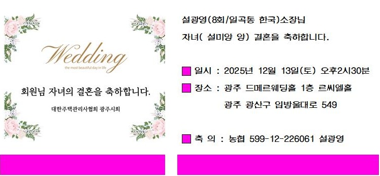 결혼 | 설광영(8회/일곡동 한국)소장님 자녀결혼 페이지 정보 작성자 관리자 작성일25-12-05 11:57 조회22회 댓글1건 관련링크 다음글 목록 본문 . 댓글목록 서금석님의 댓글 서금석 작성일 25-12-05 13:05 설광영 소장님, 따님의 결혼을 하늘만큼 축하드립니다. 설광영 소장님, 따님의 결혼을 하늘만큼 축하드립니다.