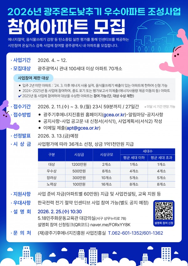 안녕하십니까. (재)광주기후에너지진흥원입니다. 진흥원에서는 「2026년 광주온도낮추기 우수아파트 조성사업」 참여아파트를 모집하고 있습니다. (구 명칭. 저탄소 녹색아파트 조성사업) 본 사업은 관내 아파트 대상 온실가스(에너지, 자원 등) 감축활동을 추진 후 평가를 통해 인센티브를 제공하는 사업입니다. ◎ 사업명 : 「2026년 광주온도낮추기 우수아파트 조성사업」 (*「저탄소 녹색아파트 조성사업」이 「광주온도낮추기 우수아파트 조성사업」으로 변경되었습니다.) ◎ 사업기간 : 2026년 4월 ~ 12월 ◎ 신청기간 : 2026년 2월 11일(수) ~ 3월 9일(월) 23시 59분까지 ◎ 신청방법 : 이메일(apt@gcea.or.kr)로 신청서, 사업계획서 제출 ◎ 모집대상 : 광주광역시 관내 100세대 이상 아파트 70개소 ◎ 우수아파트 시상(12월) : 총 36개소, 상금 총액 1억 1천만원 ◎ 지원사항 - 사업 준비 자금(아파트 별 60만원) *구 명칭 : 씨앗자금 - 아파트별 전담 컨설턴트 배정을 통한 사업 컨설팅 - 주민대상 탄소중립 생활실천 교육 및 행사 등 ◎ 사업설명회 신청 바로가기 : https://naver.me/FORxYY8K - 일시 : 2026년 2월 25일(수) 10:30 ~ 11:30 - 장소 : 5.18민주화운동교육관 대강의실(광주 서구 상무누리로 78) 많은 관심과 참여 부탁드립니다. ※ 자세한 내용은 첨부파일을 확인해 주시기 바랍니다. [문의] (재)광주기후에너지진흥원 사업진흥실 062-601-1352, 601-1362 (재)광주기후에너지진흥원 광주온도낮추기 우수아파트 조성사업 https://gcea.or.kr 062-601-1357